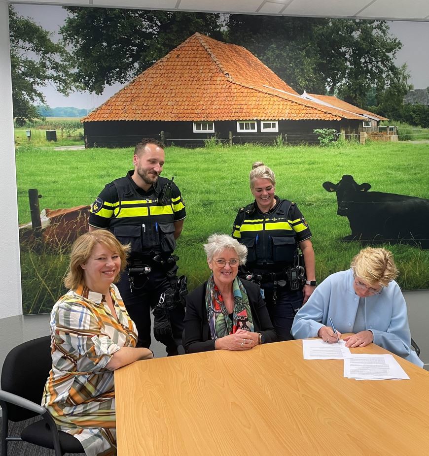 Op de foto van links naar rechts: voorste rij: Mariska ten Heuw (directeur-bestuurder Avedan), burgemeester Doret Tigchelaar van gemeente Wierden, Erna Mobach, directeur-bestuurder van Reggewoon. Achterste rij: Marlijn Zebel en Moniek Oude Luttikhuis van de politie.